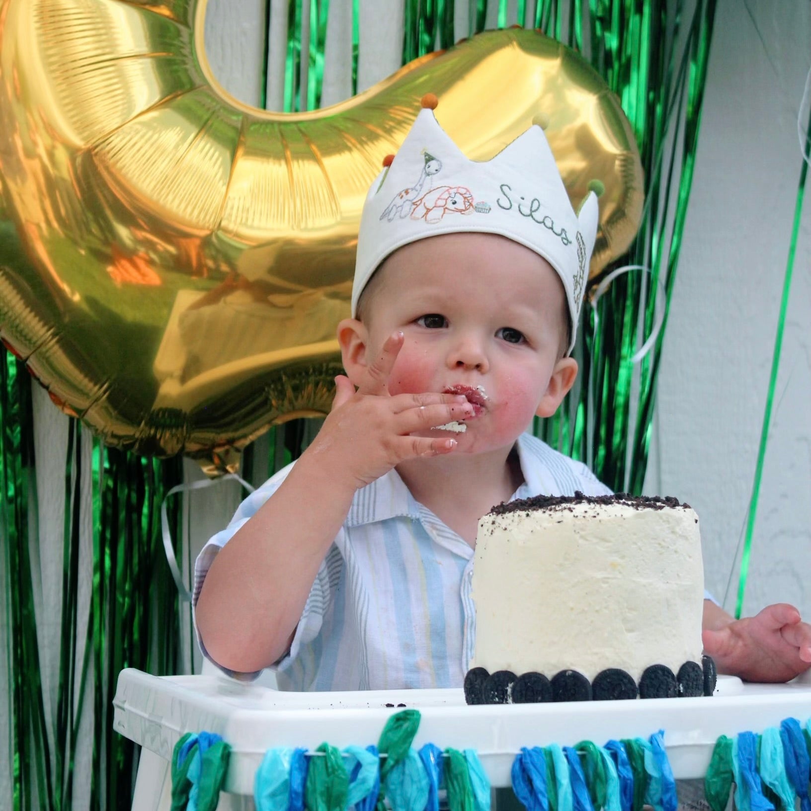 Lyndsi created the perfect crown for our son’s Silas 2nd birthday party! She even custom embroidered my illustrations of dinosaurs from his invite that I had made - the perfect touch. A cherished family heirloom now 🩵 - Mallory M.