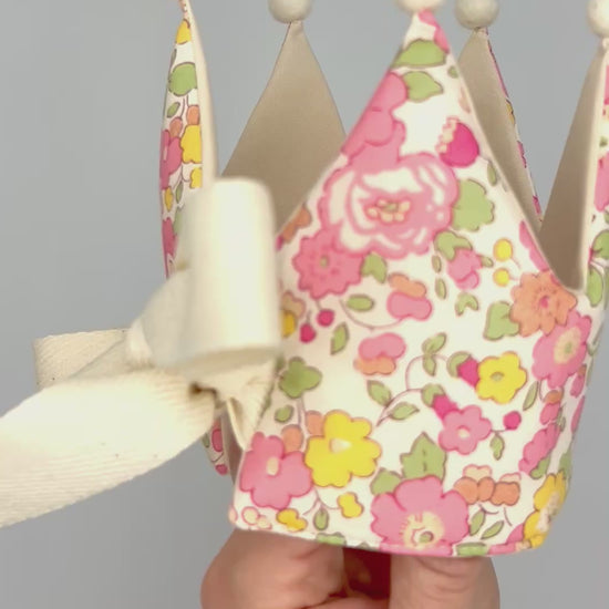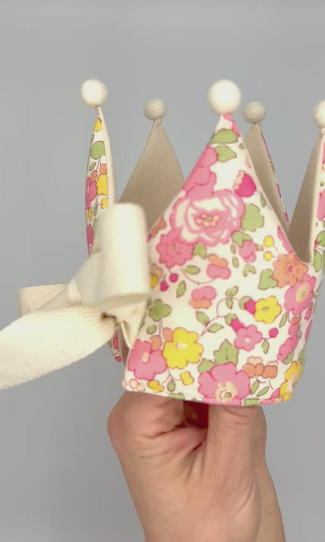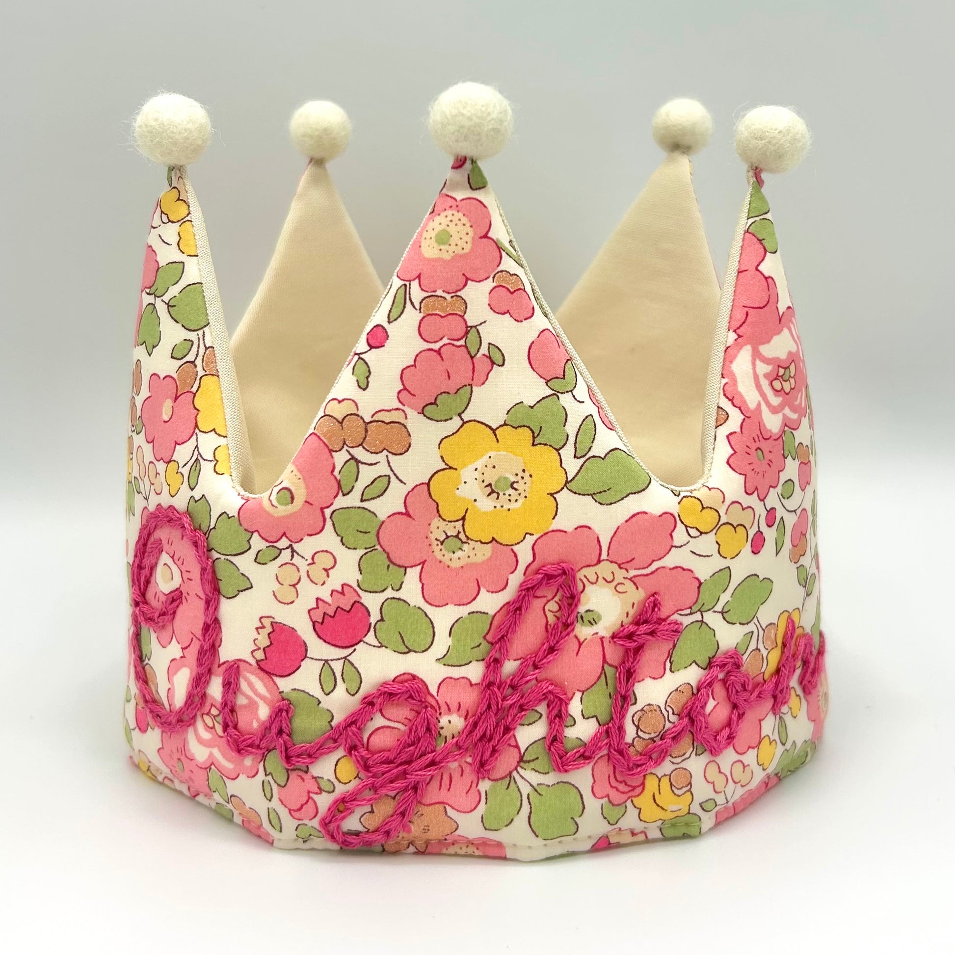 This limited edition crown features the historic fabric sent from Liberty London. Featuring vintage fabric patterns that have been around since the 1890s, these crowns are the perfect items for spring/summer born babies & birthday gifts. Choose from a delightful Indigo Fern or Tea Rose and celebrate the enduring elegance of this English heritage brand, finished with a vintage-style chain stitch for your child’s name.