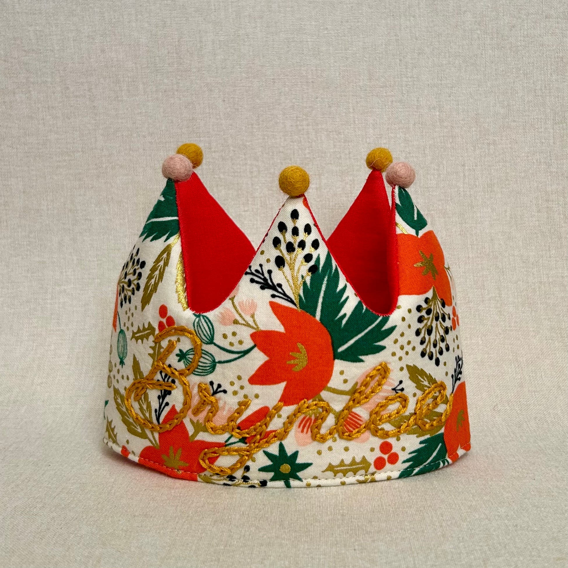 Bold red poinsettias bloom across Stella, a crown designed to echo the warmth and joy of holiday gatherings. It’s festive and refined, with a classic charm that belongs beside candlelight and carols.
